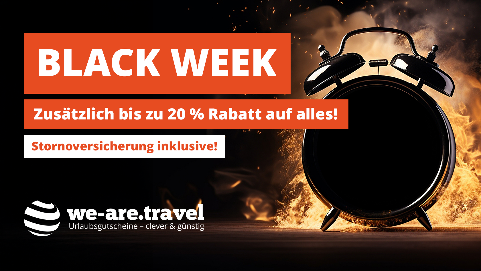 Mit dem Code BlackWeek25 sichern Sie sich bis zu 20% Rabatt auf alle Urlaubsgutscheine – plus kostenlose Stornoversicherung der HanseMerkur!