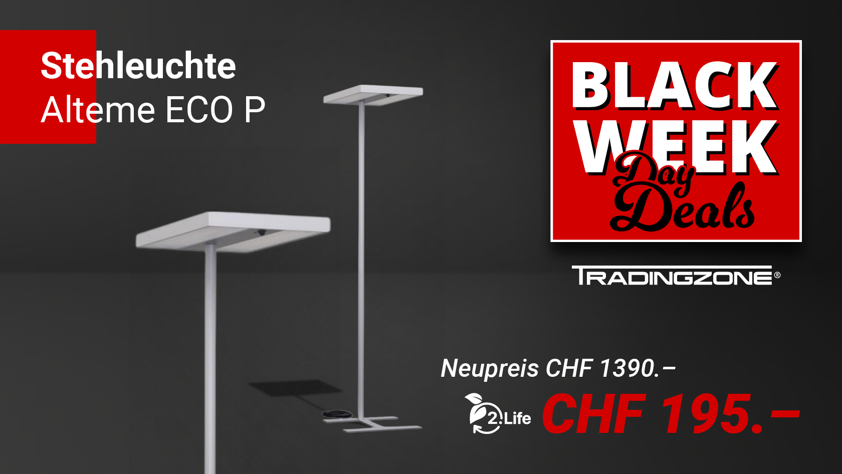Stehleuchte Alteme ECO P mit dimmbarer, effizienter Beleuchtung und Präsenzmelder. Perfekt für moderne Arbeitsplätze – jetzt im Black-Week-Angebot sichern!