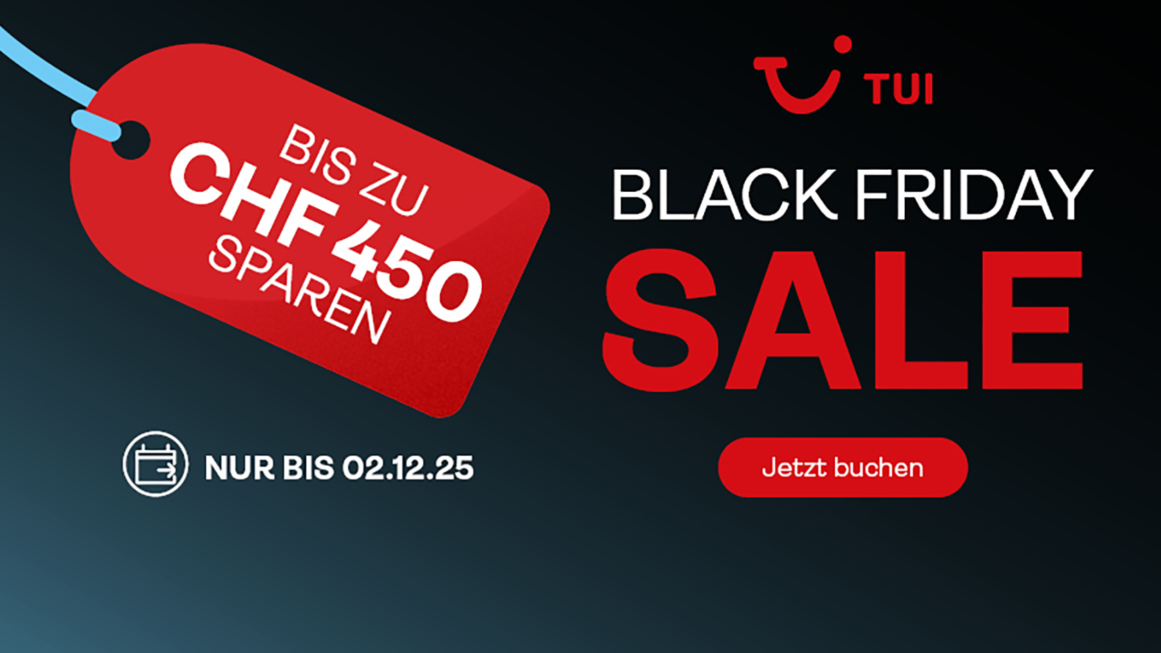 TUI Black Friday Sale: Spare bis zu CHF 450 auf deine nächste Reise! Flex Tarif inklusive – sichere dir jetzt die besten Plätze.